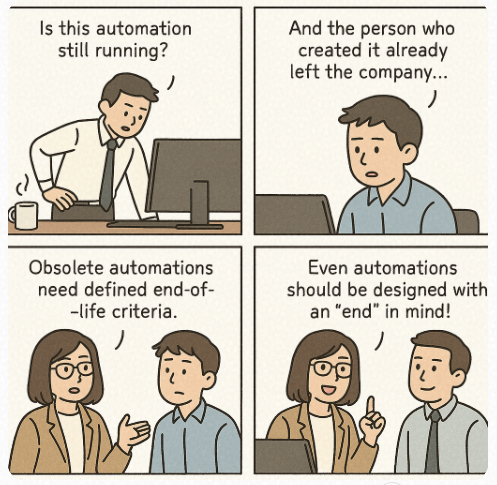 - 특정 보고서 자동화 → 담당자가 퇴사 → 시스템은 계속 실행 중