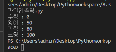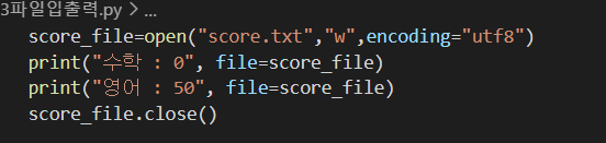 위와 같이 수학과 영어 성적을 입력한 이후 "w"쓰기를 사용하고 encoding="utf8"을 해줘야 에러가 나지 않습니다.