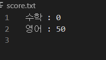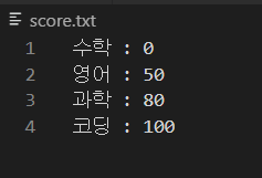 입력하면 좌측 워크페이스에 score.txt. 파일이 생성된 것을 확인할수 있으며 아래와 같이 나오는것을 확인할수 있습니다.