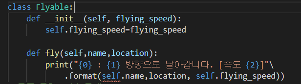 위와 같이 Flyable이라는 날수있는 기능을 가진 클래스를 생성해 보았습니다.