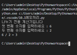 이번에는 예외처리가 잘 작동하는지 확인하기 위해 숫자 6을 한글 "이"로 나누어 보겠습니다.