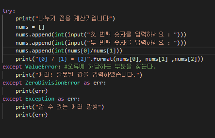 그럴때 코드가 오류가 나 작동이 되지 않게하는것이 아닌 오류를 발생시켰다는 내용이 출력되도록 하는것, 즉 예외인 부분을 처리하는것에 대해 코드를 작성해 보겠습니다.