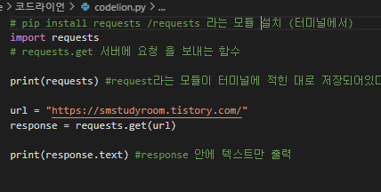 먼저 requests라는 모듈을 사용하기 위해선 파이썬 터미널에서 pip install requests를 입력해 주어야 합니다.