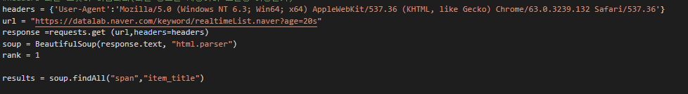 -response는 requests.get함수를 사용하여, (url,headers=headers)를 작성해줍니다.