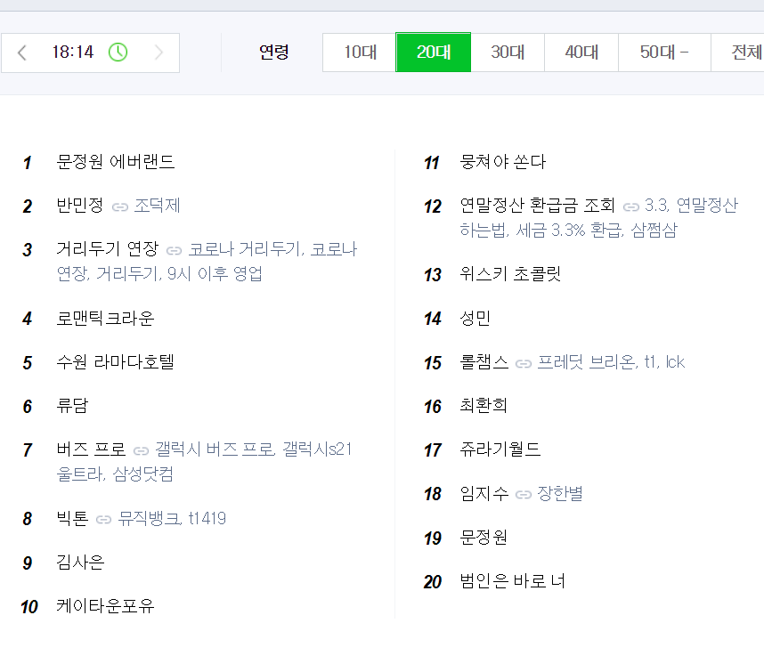 위와 같은 내용을 출력해 보려 하며, 필자의 연령인 20대를 기준으로 실시간 검색어를 출력해 보려 합니다.