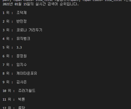 실시간 검색어의 태그들은 공통적으로 "span", "item_title"을 포함하고 있으므로 findAll함수를 사용하여 이를 추출해줍니다.