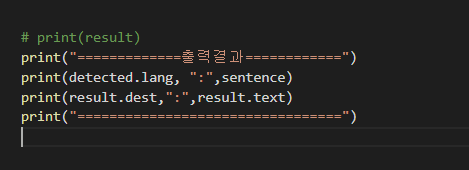 이제 result변수를 만들어 sentence의 문장을 번역해 주도록 해보겠습니다.