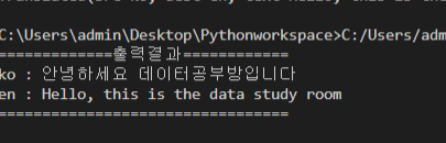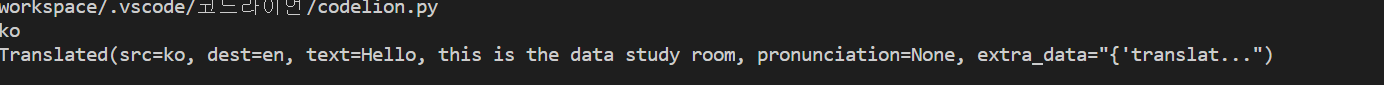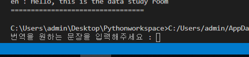 "안녕하세요 데이터 공부방입니다"라는 문구가 "Hello, this is the data study room"으로 잘 번역된 것을 확인할 수 있습니다.