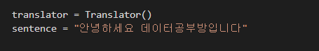 그리고 번역할내용을 설정하여 sentence라는 변수에 내가 변역하고 싶은 내용을 한국어로 설정하였습니다.
