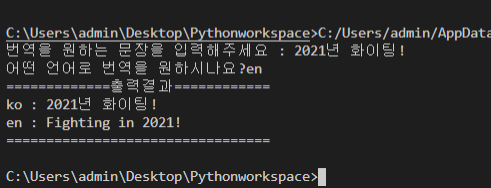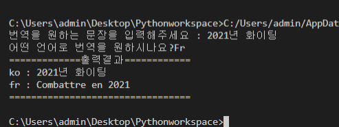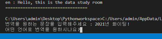 위와 같이, 일일히 sentence와 dest를 변경하지 않아도 input을 통해 번역이 되는 번역기 프로그램이 생성되었음을 확인할 수 있습니다.