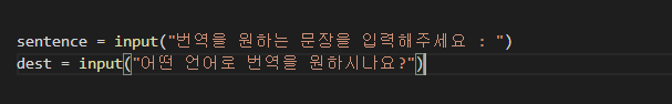 input()함수를 사용하여, 번역할 언어를 입력하고, 번역할 내용을 입력하여 값이 나오도록 만들어 보겠습니다.