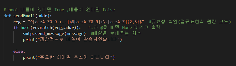 그리고 (addr)을 불리안 함수를 통해 유효성에 적합하다면 메일을 보내주고, 정상적으로 출력되었다는 내용을 출력해주는 코드를 작성해주었습니다.