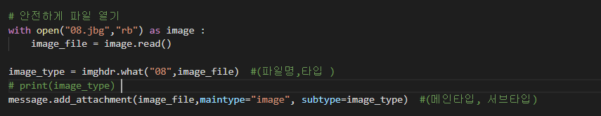 그리고 image_type이라는 변수에 imghdr.what(파일명,타입)을 작성해주어서 메일에 첨부할 사진의 서브타입을 만들었습니다.