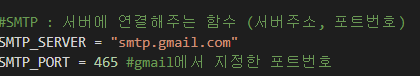 smtp를 이용하여, 아까 설정한 SMTP_SERVER와 SMTP_PORT를 입력해 줍니다.