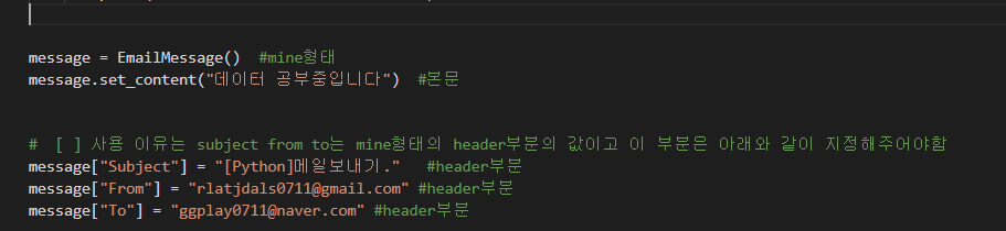 그리고 'email.message'에서 'EmailMessage'만 사용할 것인데 'EmailMessage'는 우리가 작성하고자 하는 이메일을 mine형태로 변환해 주는것을 의미합니다.