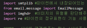 그리고 'imghdr'은 이미지의 유형을 판단해주는 역할을 하는데 이번 메일에서 이미지를 첨부하여 보낼예정이기 때문에 필요한 라이브러리입니다.