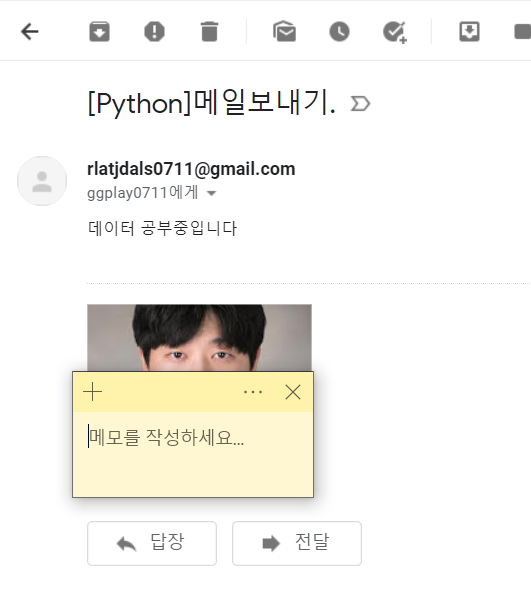 마지막으로 message.add_attachment()함수를 사용하여 이미지파일, 메인타입,서브타입을 작성하여 메일에 첨부하였습니다.