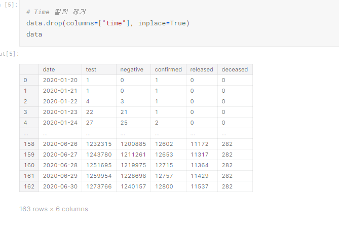 위와 같이 "time"컬럼을 제거하고 데이터를 다시 확인해보면, "time"컬럼이 잘 제거된 부분을 확인할 수 있습니다.