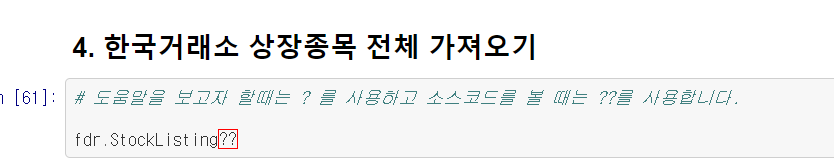 fdr.Stocklisting의 사용법을 알기 위해서는 위와 같이 물음표1개 or 물음표 2개를 사용하여 자세히 알아볼 수 있습니다.