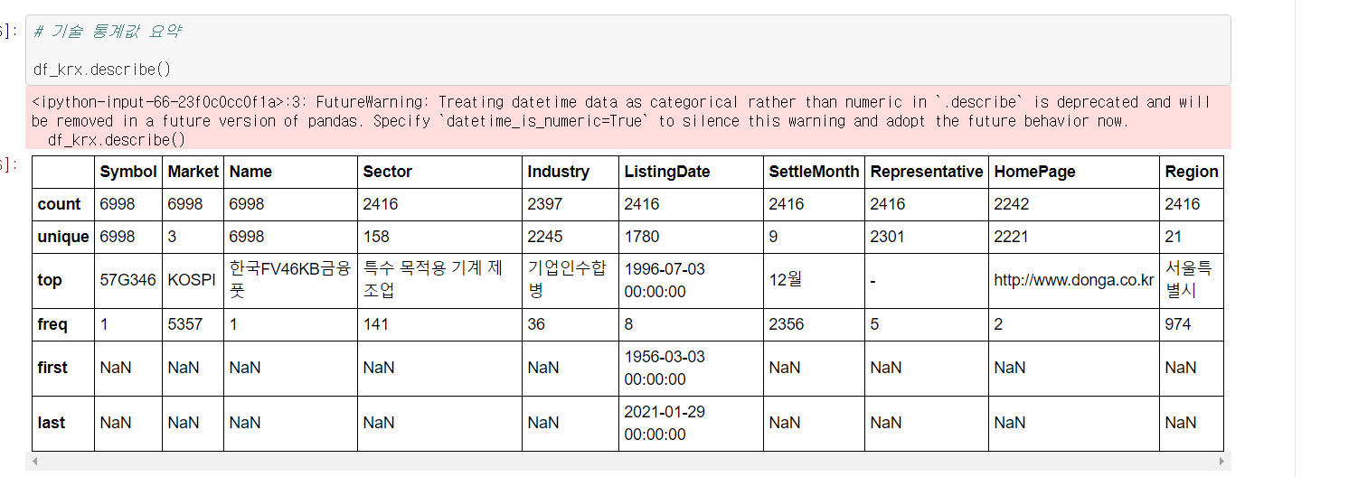 그리고 데이터 프레임 형식으로 만들어, 모양을 살펴보면, 상장 종목 전체의 행과 열을 확인할 수 있습니다.