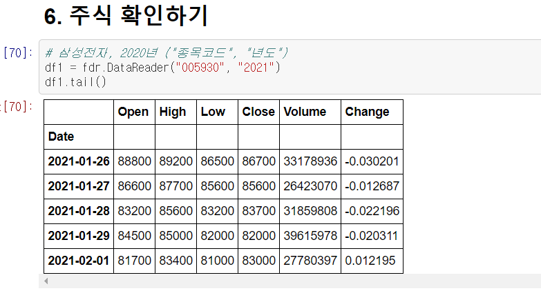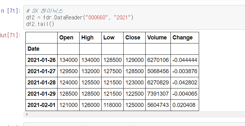 위와 같이 fdr.DataReader()함수를 이용하고 (종목코드, 원하는 년도)를 작성하면 됩니다.