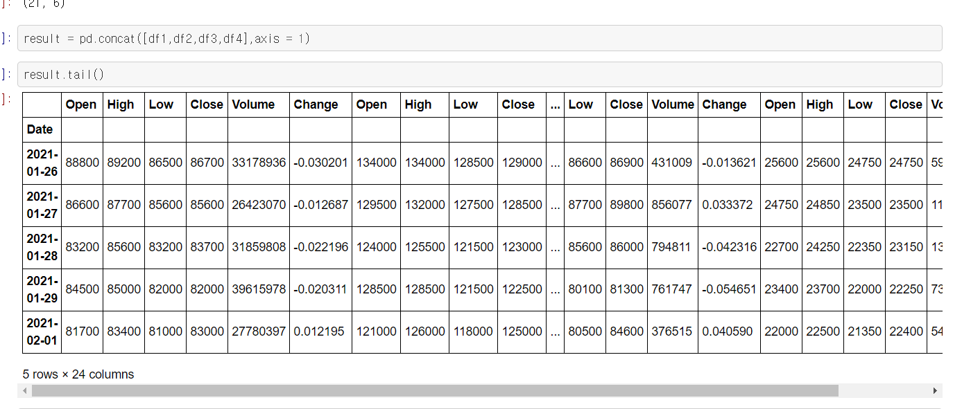 이번에는 4개의 주식을 한번에 보고싶을때, 각 데이터프레임을 4개를 생성하고 하나로 합쳐서 확인하였습니다.