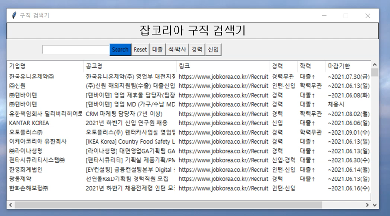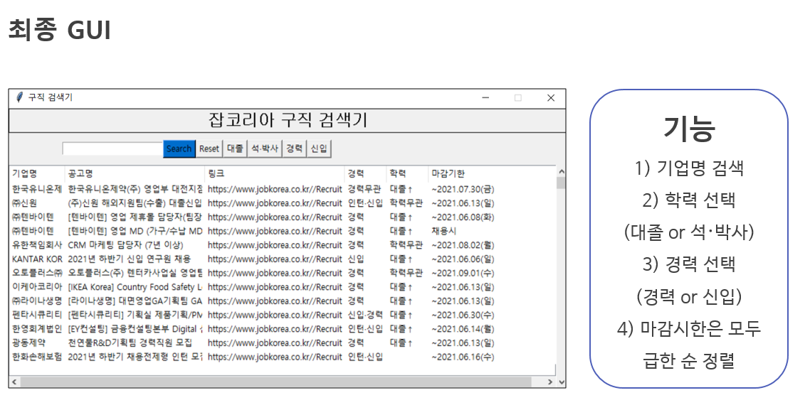 위와 같이, 본인의 학력, 경력에 맞춘 기업 공고명들을 확인할 수 있고, 마감시한이 급한 순서대로 확인할 수 있으며, 기업들을 검색할 수 있는 최종 GUI입니다.