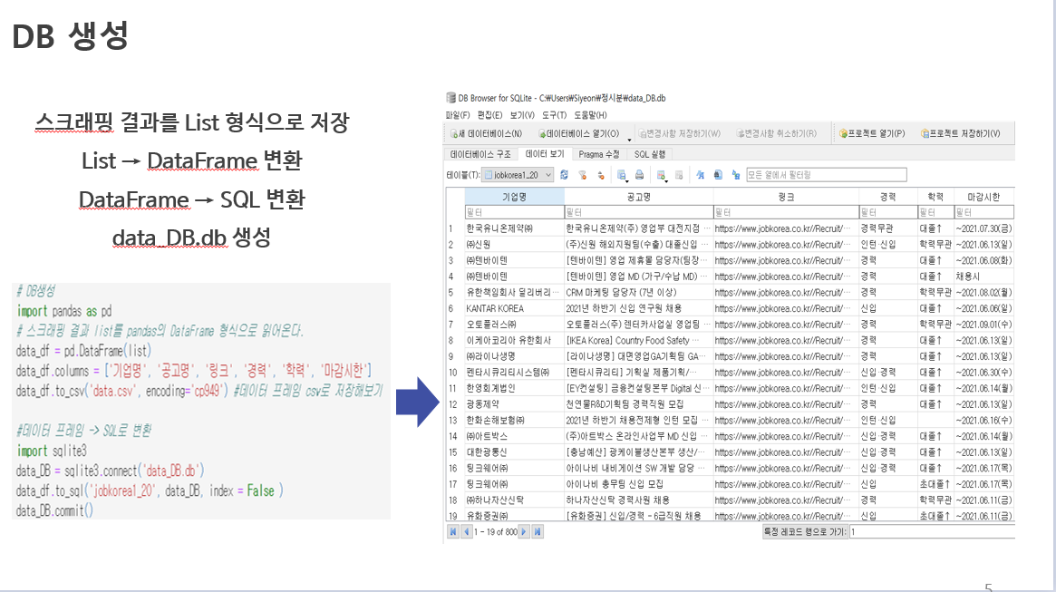 위와 같은 코드를 이용하여 잡코리아에서 기업명에 따른 공고명, 링크, 경력, 학력, 마감시한 등에 데이터를 불러들였습니다.