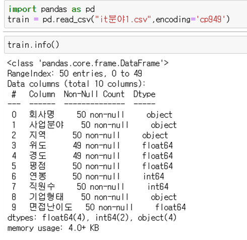 위 데이터의 모습은 다양한 분야 중 IT분야에 대한 기업만을 가져온 모습이고, 한 기업에 대해 총 8개의 칼럼이 구성되어 있는 모습입니다.