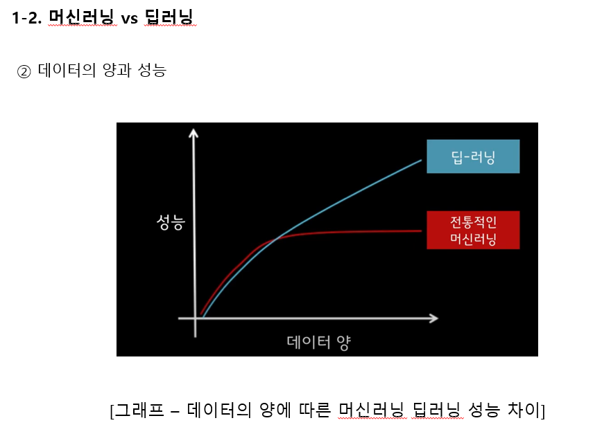 머신러닝의 경우는 데이터 양이 많다가 어느 부분이 되면 성능이 더이상 증가하지 않고 유지되는 것을 확인할수 잇지만, 딥러닝의 경우 데이터가 많으면 많을수록 성능이 좋아지는것을 확인할 수 있습니다.