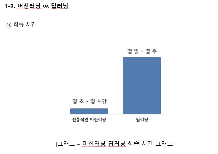 위와 같이 학습 시간으로 차이를 보자면 머신러닝은 짧은 시간내 결과를 확인할수 있습니다.