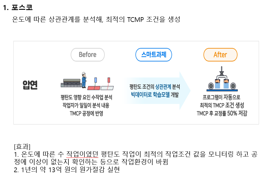 포스코의 경우 작업자의 감에 의존했던 공정에 있어 데이터 상관성 분석을 통해 해당 작업의 최적 공정 조건을 파악해 냈고, 이를 자동화를 통해 동일 품질, 동일 제조시간, 최적의 공정 조건을 도출해 내었습니다.