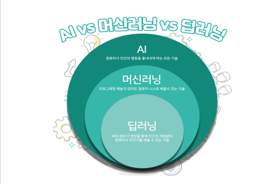 AI라는 큰 기술안에 머신러닝이 있는것이며, 머신러닝 안에서 머신러닝의 고급 기술을 딥러닝이라고 생각하면 될것 같습니다.