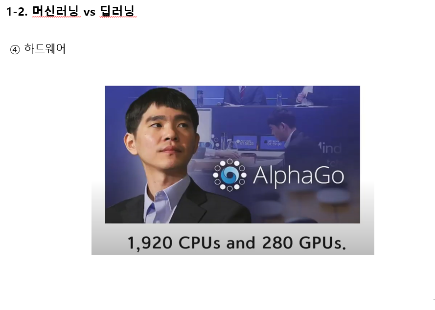실제로 딥러닝의 가장 대표적인 예인 '알파고'는 1920개의 CPU와 280개의 GPU가 필요했다고 합니다.