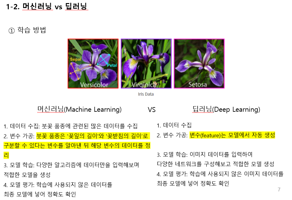 위와 같이 머신러닝의 경우, 붓꽃 품종을 구분하는데 있어 '꽃받침의 길이'라는 변수를 파악해내고 해당 변수를 중점으로 모델을 개발하는 반면, 딥러닝의 경우 변수 자체를 자동으로 판단해 모델을 개발합니다.