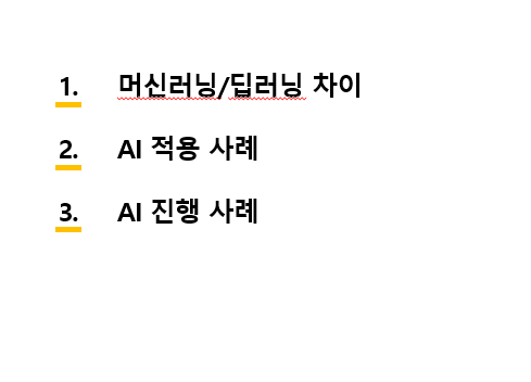 현업분들이 AI를 도입하기 위해, AI가 어떤것이고, 흔히 말하는 딥러닝과 머신러닝의 차이, 그리고 어떻게 AI가 적용되고 있는지에 대해 알아보겠습니다.