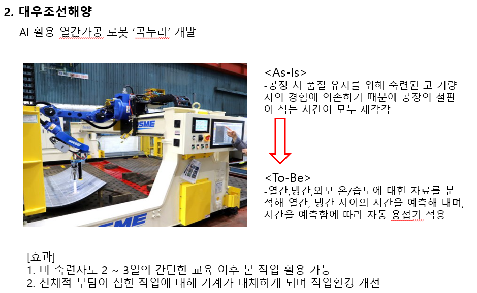 열간가공 작업은 작업자 환경이 매우 열악하고, 근무 난이도가 높은 공정이였습니다. 이또한, 해당 공정에 있어 온/습도에 따라 각각 다른 공정 시간 및 동일하지 못한 품질이 도출되었고 이를 데이터화를 통해 최적의 공정조건을 도출해낼수 있었고, 로봇을 도입하여 업무 자동화를 도출해 낼 수 있었습니다.