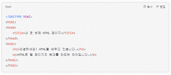 💡 HTML(HyperText Markup Language) 은 웹 문서를 만들기 위한 표준 마크업 언어입니다.