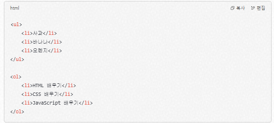 💡 목록을 만들 때는 <ul> 또는 <ol>을 사용하고, <li>로 항목을 추가합니다.