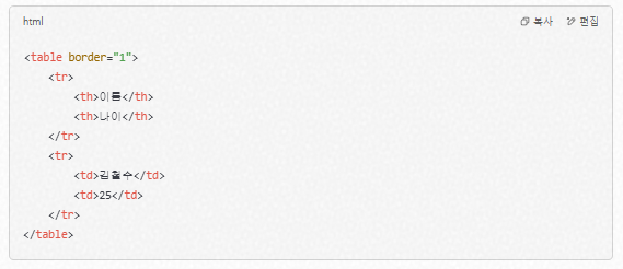 💡 표에서 border="1"을 추가하면 테두리가 보입니다.