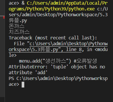 그리고, 튜플의 특징인 연산이 불가능 하다는 것을 확인해보겠습니다.