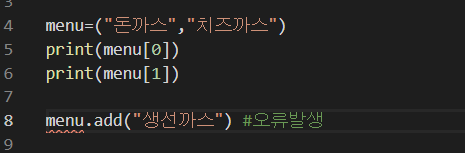 아래와 같이 메뉴라는 변수를 만들고, 그 안에 생선까스를 추가해 보았습니다.