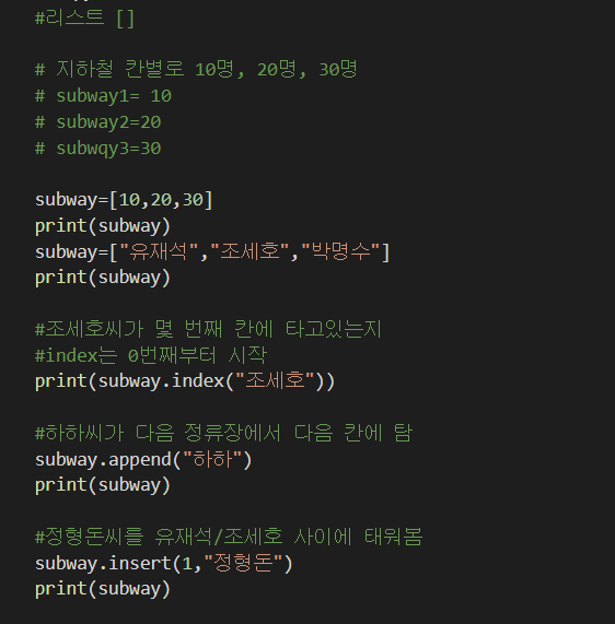 파이썬에서 리스트는 쉽게 말해 지하철의 한 열차라고 생각하면 됩니다.