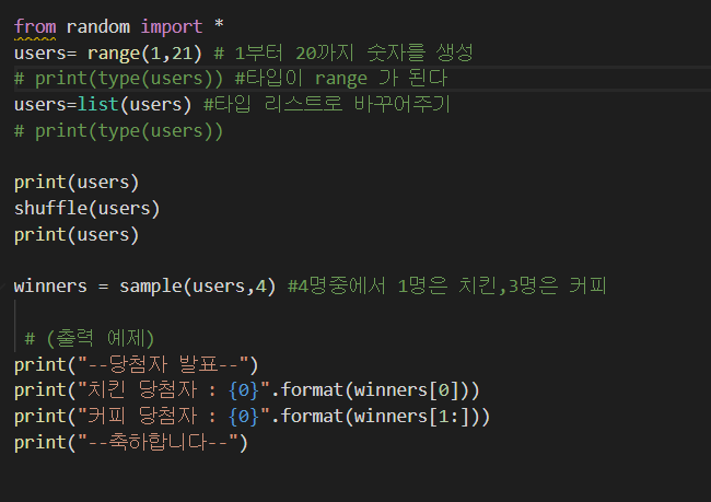 winners=sample(users,4) 이는 users라는 변수에서 4명을 추출해주는 변수입니다.